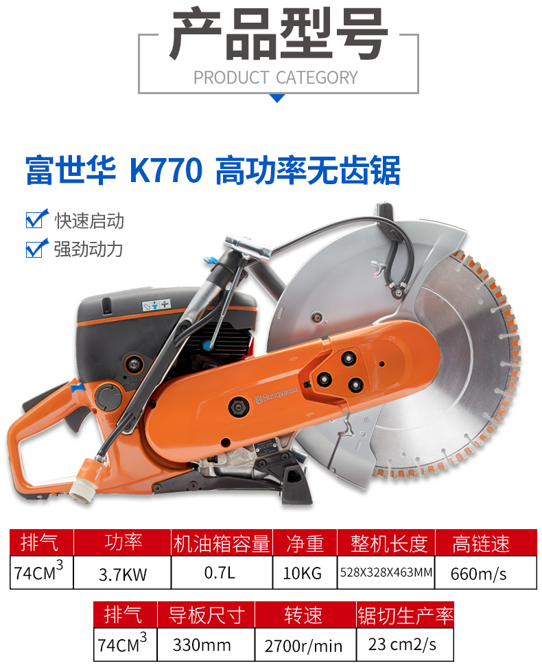 富世華K770手持式切割鋸的zui大切割深度達(dá)到125 mm,鋸片zui大直徑為350mm,zui大輸出功率為3.7kw。