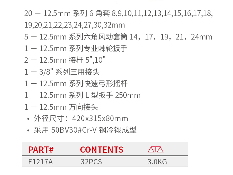 商品名稱:力易得32件12.5mm系列套筒組套E1217A