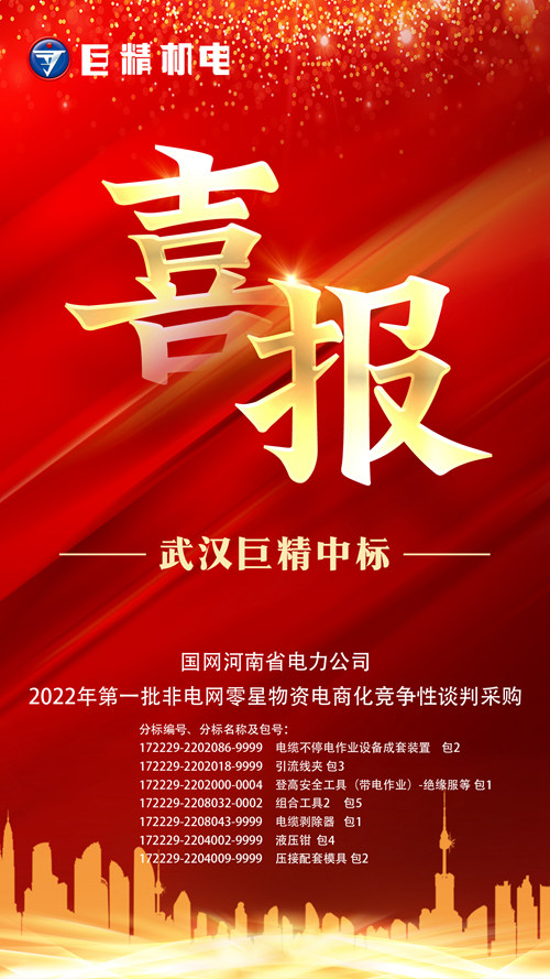 熱烈祝賀武漢巨精機(jī)電有限公司中標(biāo)國網(wǎng)河南省電力公司2022年第一批非電網(wǎng)零星物資電商化(172229)競爭性談判采購項(xiàng)目